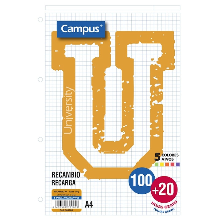 Recambio Campus. Tamaño A4, medidas: 210 x 297 mm. Contiene 100+20 hojas de 90 gramos. 5 bandas de colores vivos. Rayado: cuadrícula 5x5 mm.