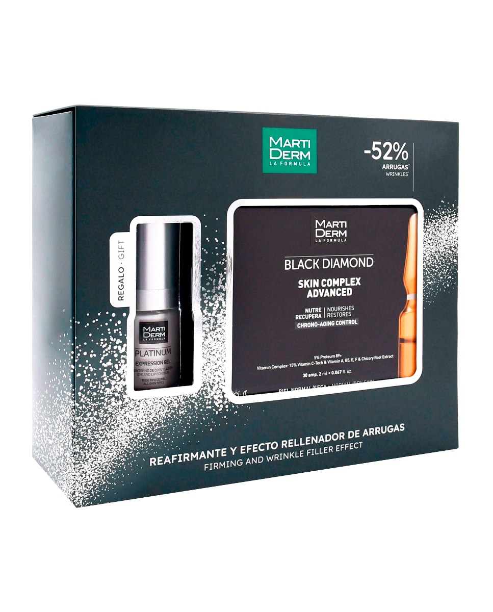 El Cofre Skin Complex de Martiderm contiene 30 ampollas antiedad formuladas con Proteum 89 y un complejo vitamínico que proporciona un efecto antioxidante intensivo. Estas ampollas están diseñadas para prevenir y combatir los signos del envejecimiento, mejorando la luminosidad e hidratación de la piel. El cofre incluye un regalo adicional, el Expression Gel, un sérum de uso localizado que alisa y redensifica las líneas de expresión, así como el contorno de ojos y labios, suavizando su apariencia y reforzando la elasticidad de la piel. Este producto está dirigido al público femenino y se presenta en un estuche de regalo.