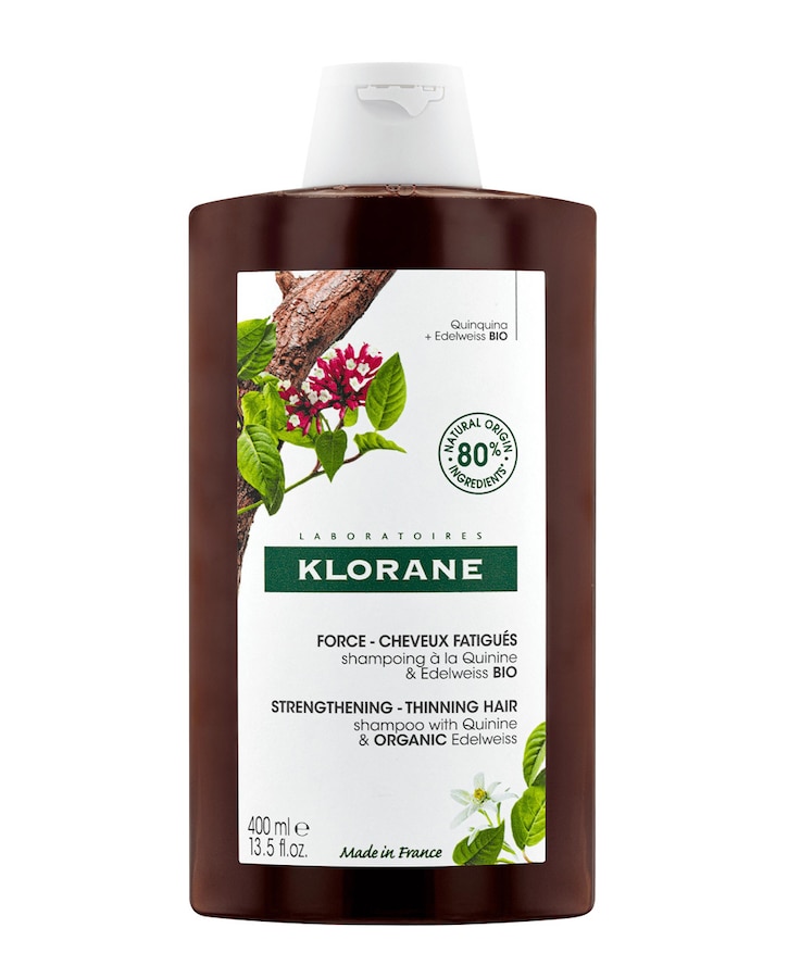 El champú a la Quinina y Edelweiss Bio de Klorane es un producto fortificante para cabellos debilitados o con tendencia a la caída. Contiene extractos vegetales de Quinina y Edelweiss, así como vitaminas B, que contribuyen a fortalecer el cabello y estimular su crecimiento. Su fórmula es adecuada para uso frecuente y puede ser utilizado solo o como complemento de tratamientos anticaída. Está compuesto en un 80% por ingredientes de origen natural y no incluye tensioactivos sulfatados, siliconas ni aceites minerales. Es vegano y biodegradable, lo que lo hace respetuoso con el medio ambiente. Se aplica haciendo espuma sobre el cabello húmedo y luego se aclara.