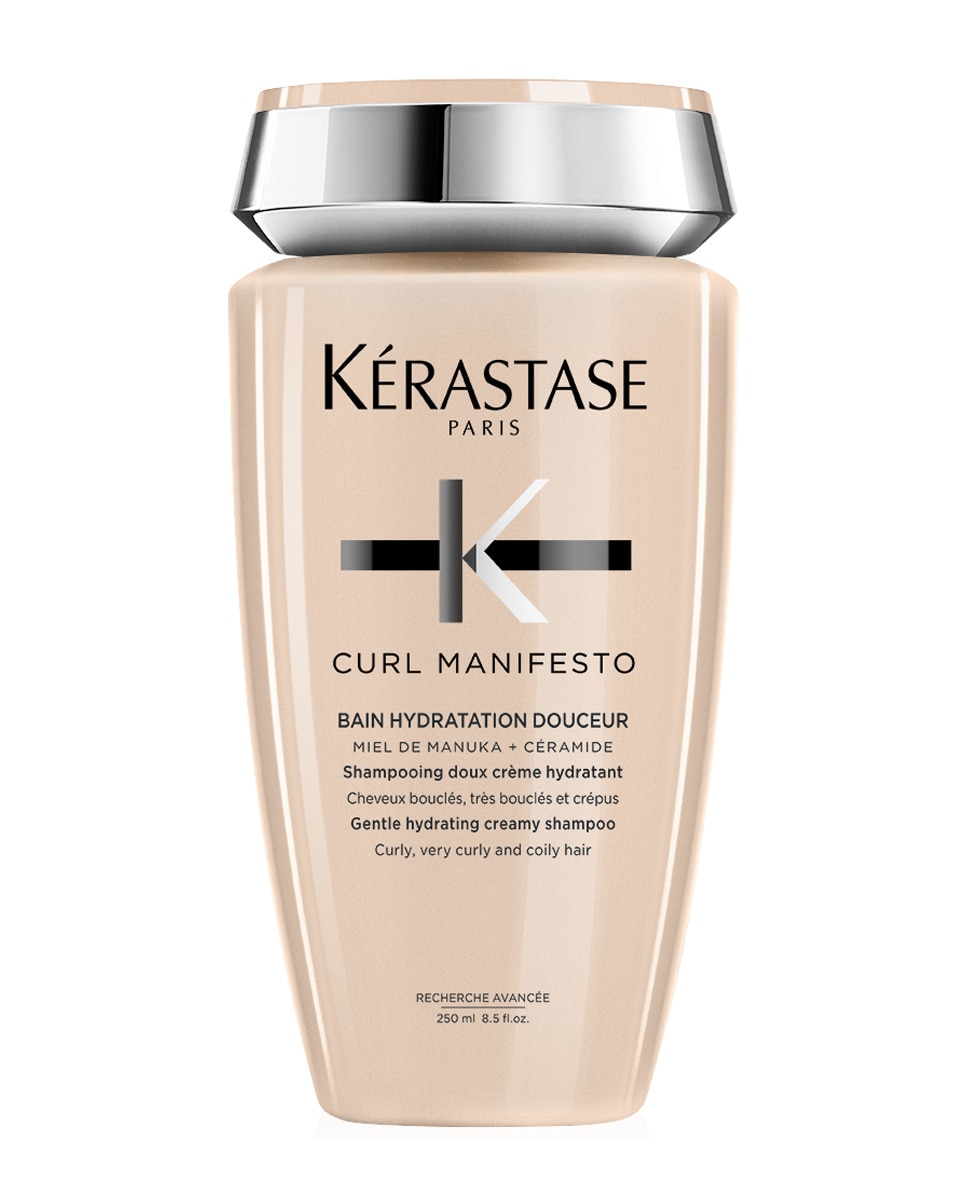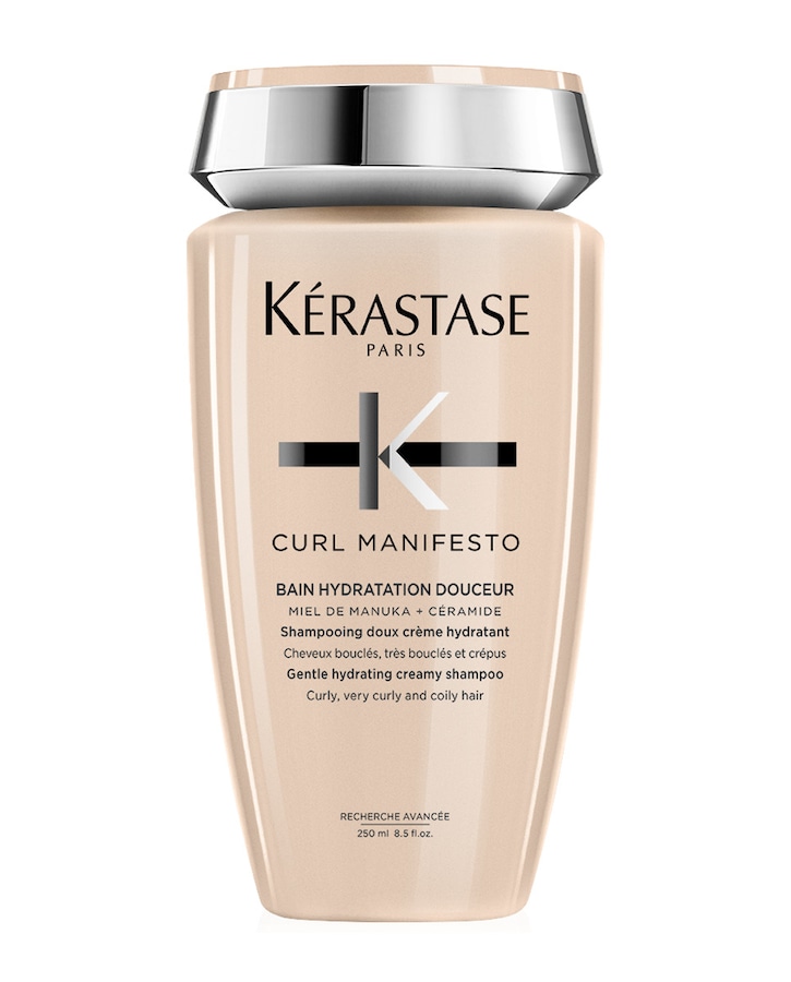 Bain hydratation douceur de Kérastase. Champú cremoso e hidratante para cabello ondulado, rizado o afro. Limpia suavemente el cuero cabelludo y el cabello además de aportar todos los activos de la fórmula, hidratando intensamente los rizos.