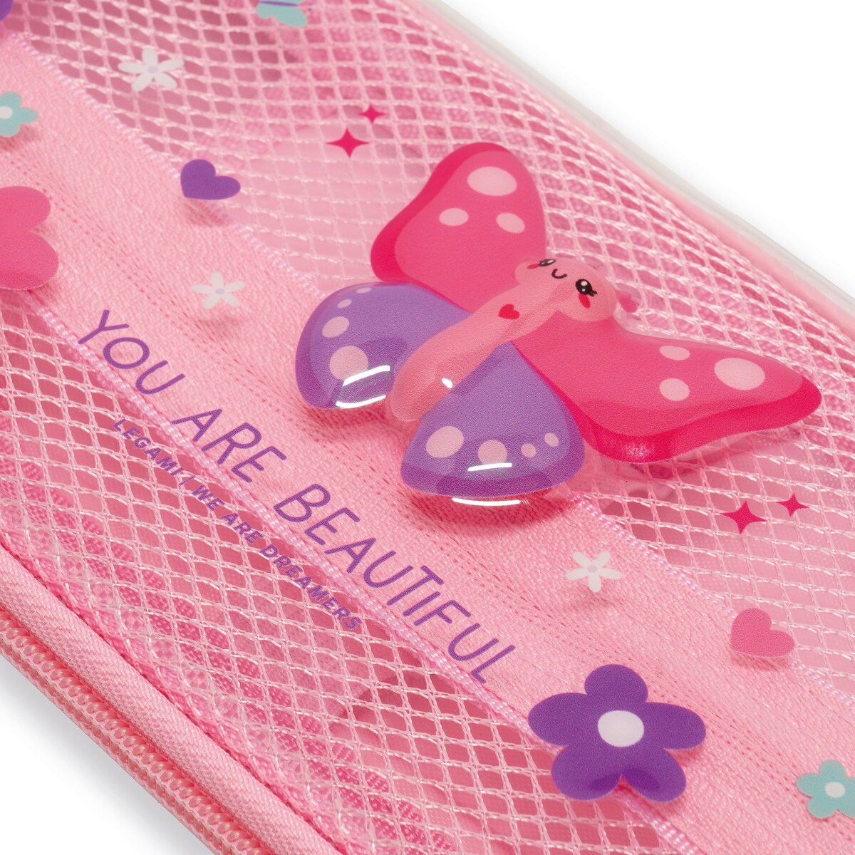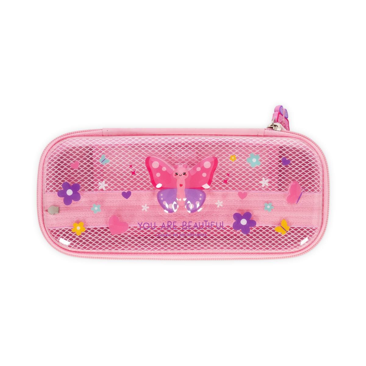 El estuche Legami Butterfly es un accesorio diseñado para organizar útiles escolares o de oficina. Dispone de dos compartimentos que permiten una distribución eficiente de los objetos, además de un módulo específico para bolígrafos. El compartimento interno está fabricado con un tejido de malla que facilita la visibilidad y el acceso a su contenido. Se cierra de manera segura con una cremallera. Está elaborado con materiales como PET, PU, EVA y poliéster, lo que garantiza durabilidad y resistencia.