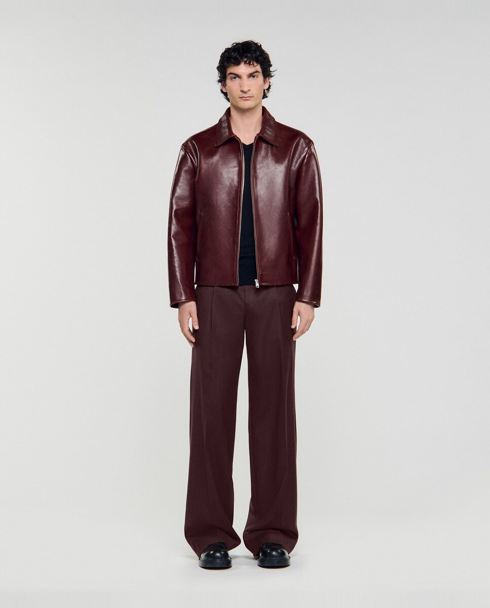 Cazadora de piel de hombre con cuello camisero y cremallera